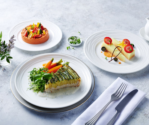 In First class, customers will be treated to elevated vegan cuisine like pumpkin and barley risotto served with rocket, caramelised walnuts, vinaigrette and vegan cheese. Dishes offering a burst of flavours include quinoa salad with grilled aubergine, courgette, sautéed Swiss chard and red pepper coulis. Decadent desserts include strawberry tart with vanilla custard and pistachios, served with berry compote, or a tempting sticky date pudding served with salted caramel sauce, vegan cream cheese, candied pecans and almond butter.